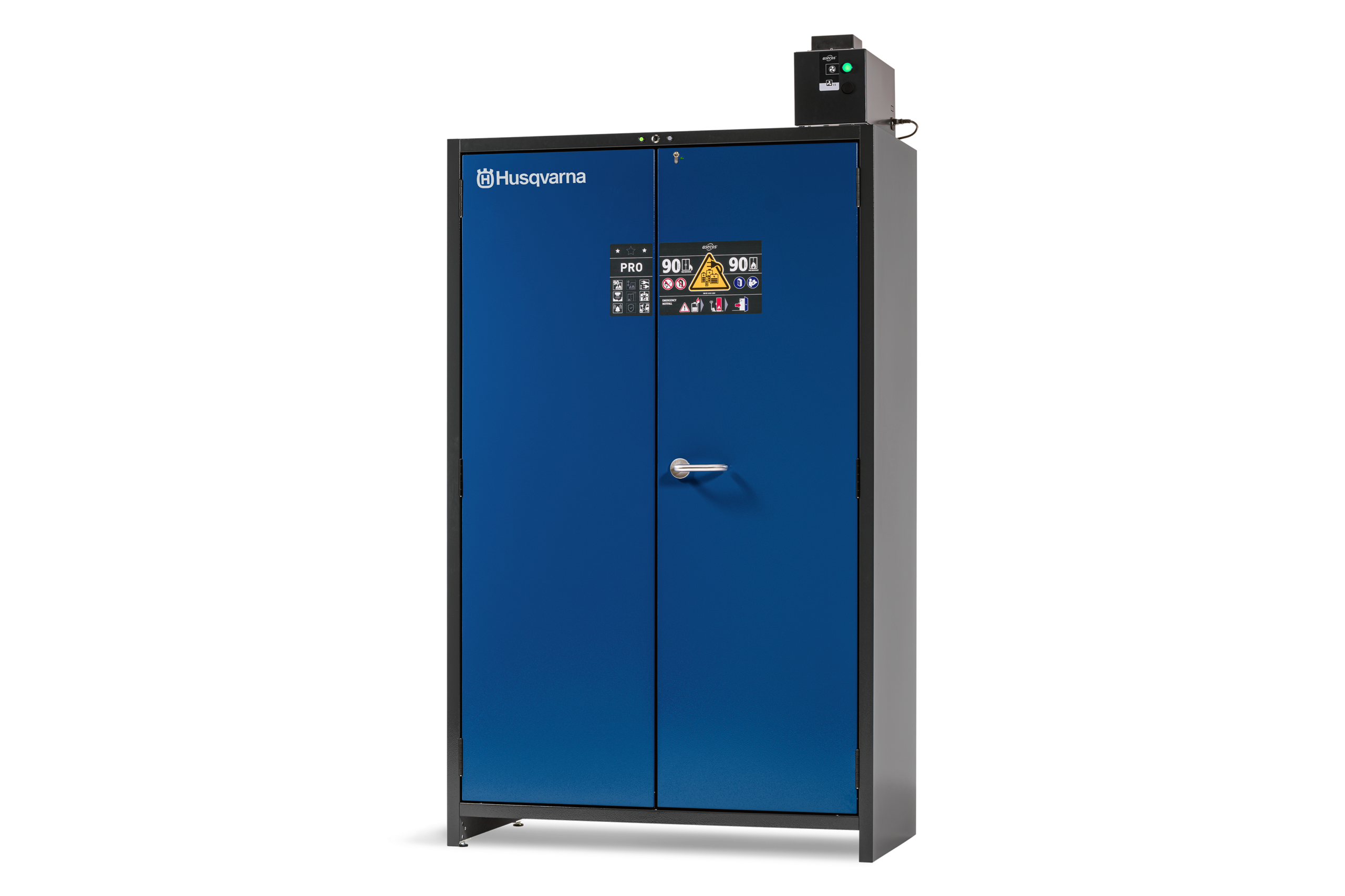 Husqvarnas batteriladdningsskåp L är konstruerat för säker och godkänd förvaring och laddning av litiumjonbatterier. Detta rymliga 230V-skåp erbjuder 90 minuters brandmotstånd från utsidan in och inifrån och ut*. Utrustad med en rökdetektor och en temperatursensor som ger tidig upptäckt av begynnande bränder och ventilationsfel. Brandsläckningssystemet utlöses automatiskt vid brand, medan larmsystemet ser till att larm på plats skickas omgående. Dessutom upprätthåller det aktiva ventilationssystemet optimala förhållanden för batterier och laddare, vilket förhindrar värmeuppbyggnad under laddningsprocessen. Grenuttag och höjdjusterbara hyllor för skräddarsydda förvaringslösningar ingår.